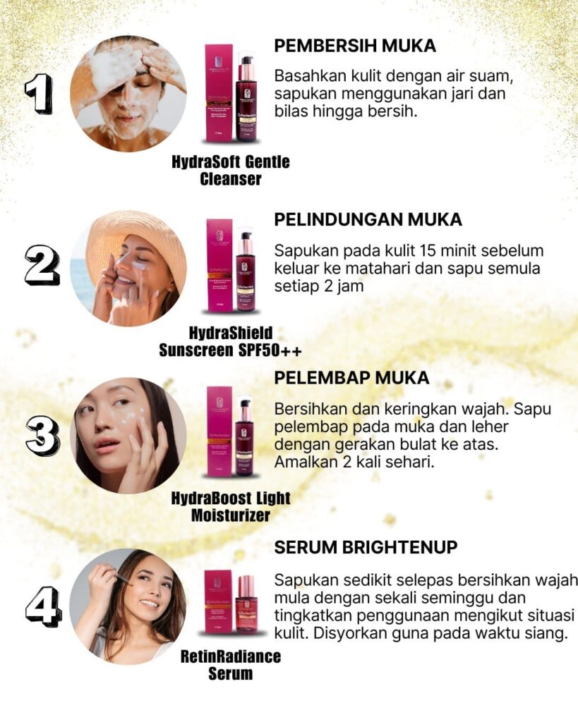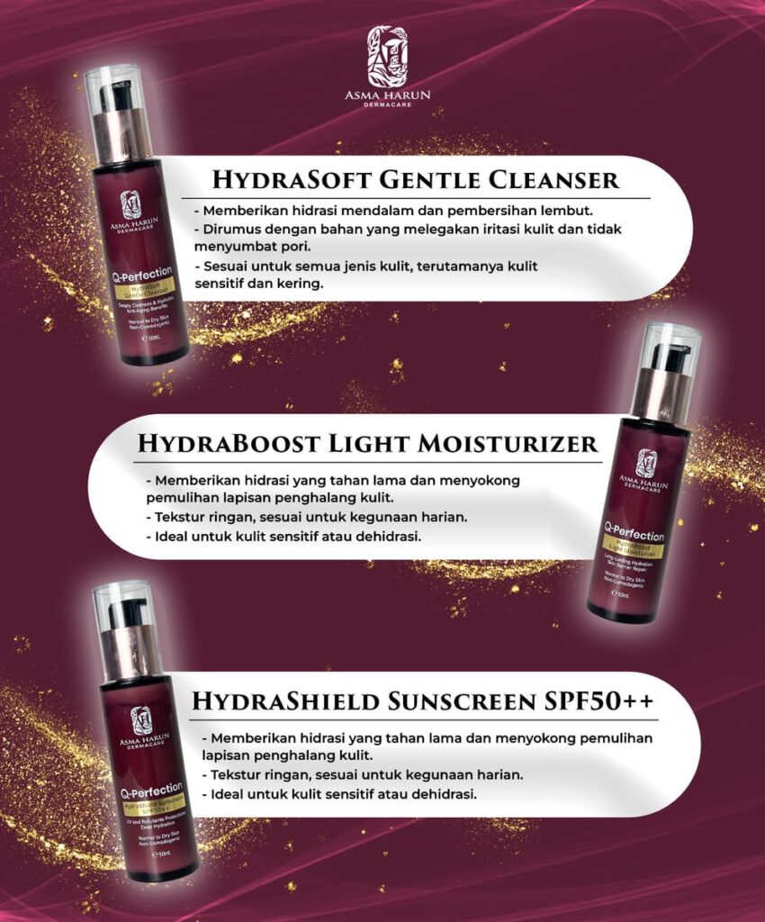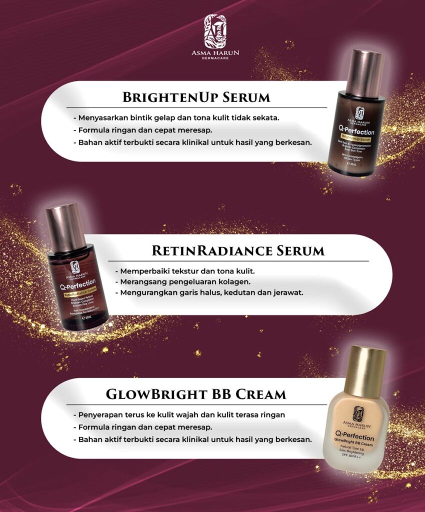 Setiap produk dalam Asma Harun Dermacare direka untuk melengkapi antara satu sama lain – dari pencuci, pelembap, serum hingga ke pelindung matahari – supaya kulit anda mendapat penjagaan menyeluruh.