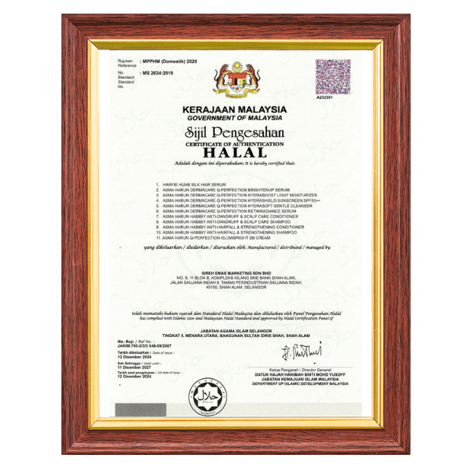 Ya, semua produk kami mempunyai sijil HALAL yang sah dan dihasilkan dengan penuh ketelitian, tanpa alkohol, bahan najis atau meragukan.